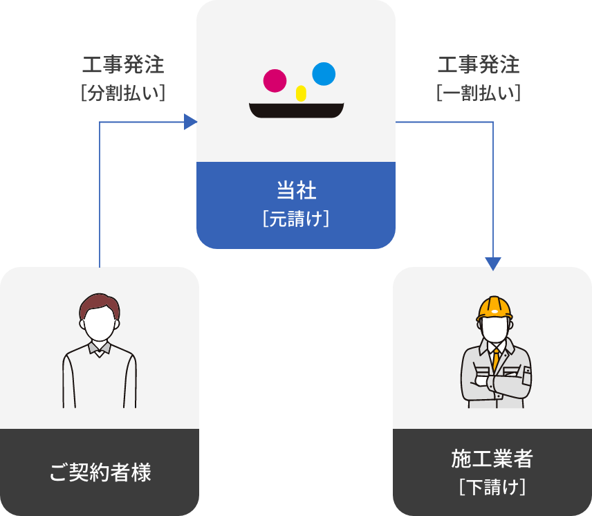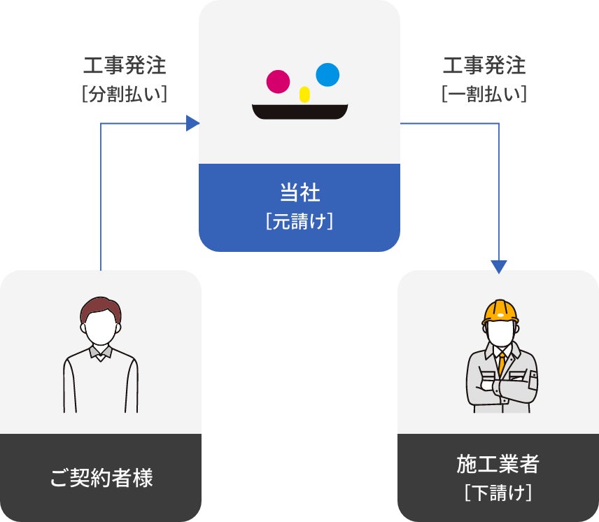 「BRO-ZERO」は、当社が金融機関と連携し「債権流動化」という仕組みを利用して提供する、独自のファイナンススキームです。リフォームや修繕・設備導入工事を当社が元請けとなり全額立て替えることで、オーナー様は初期導入費用ゼロ円(※)で不動産の価値を高めることができます。※初期導入費用ゼロ円とは、初期費用相当額を分割払いにしたプランです。