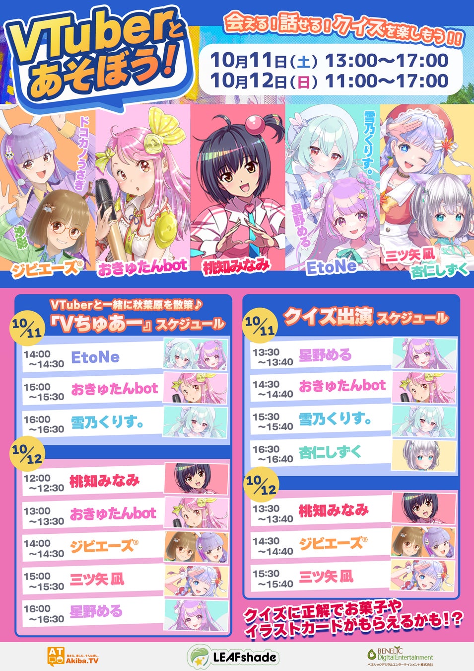 VTuberとトークできる無料交流体験、VTuebrの最新情報を掲載した自社広報誌『LEAFマガジン』の配布、VTuberカードゲーム『VoV(Virtual of Versus)』の体験・販売コーナーなどが楽しめる内容となっています。