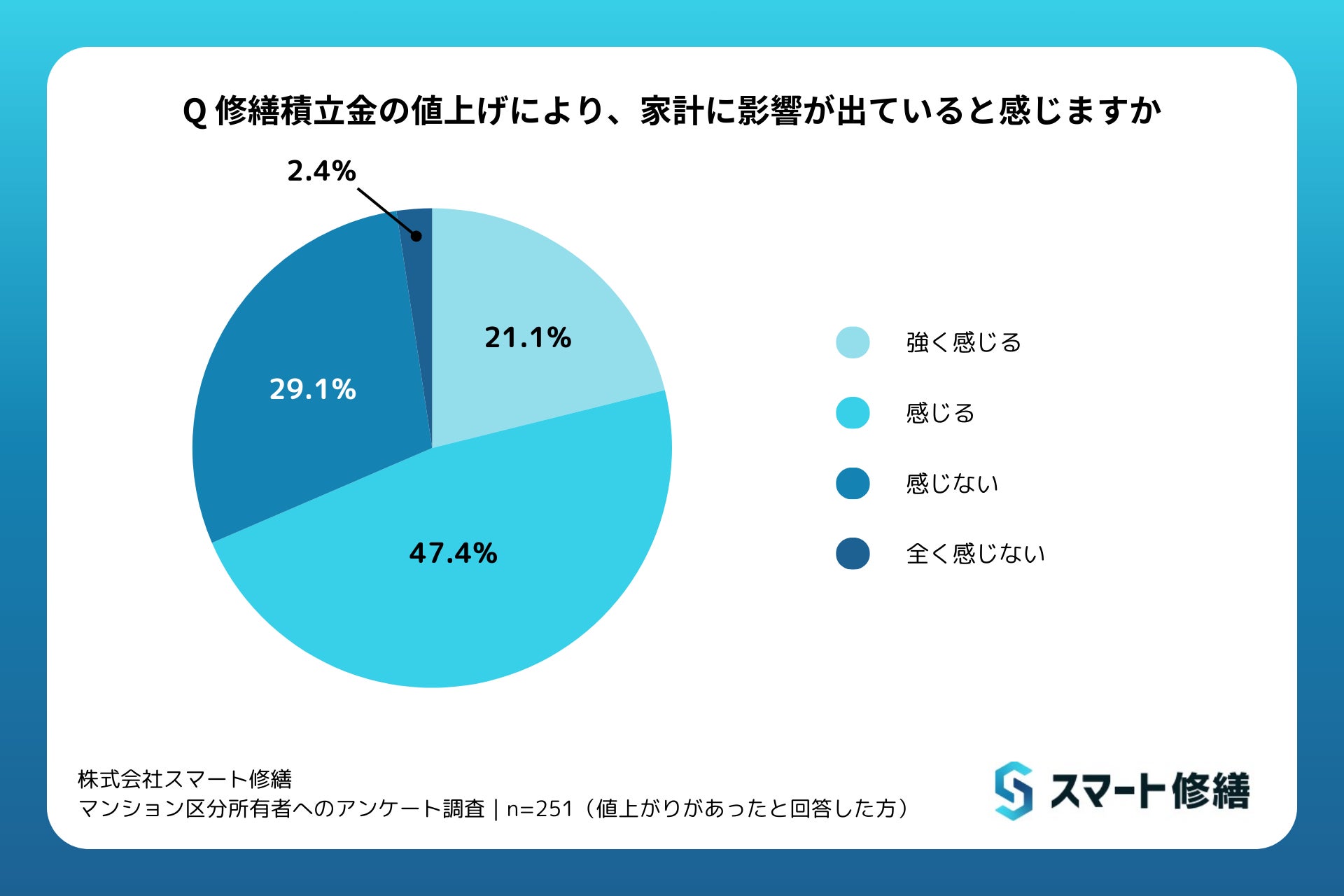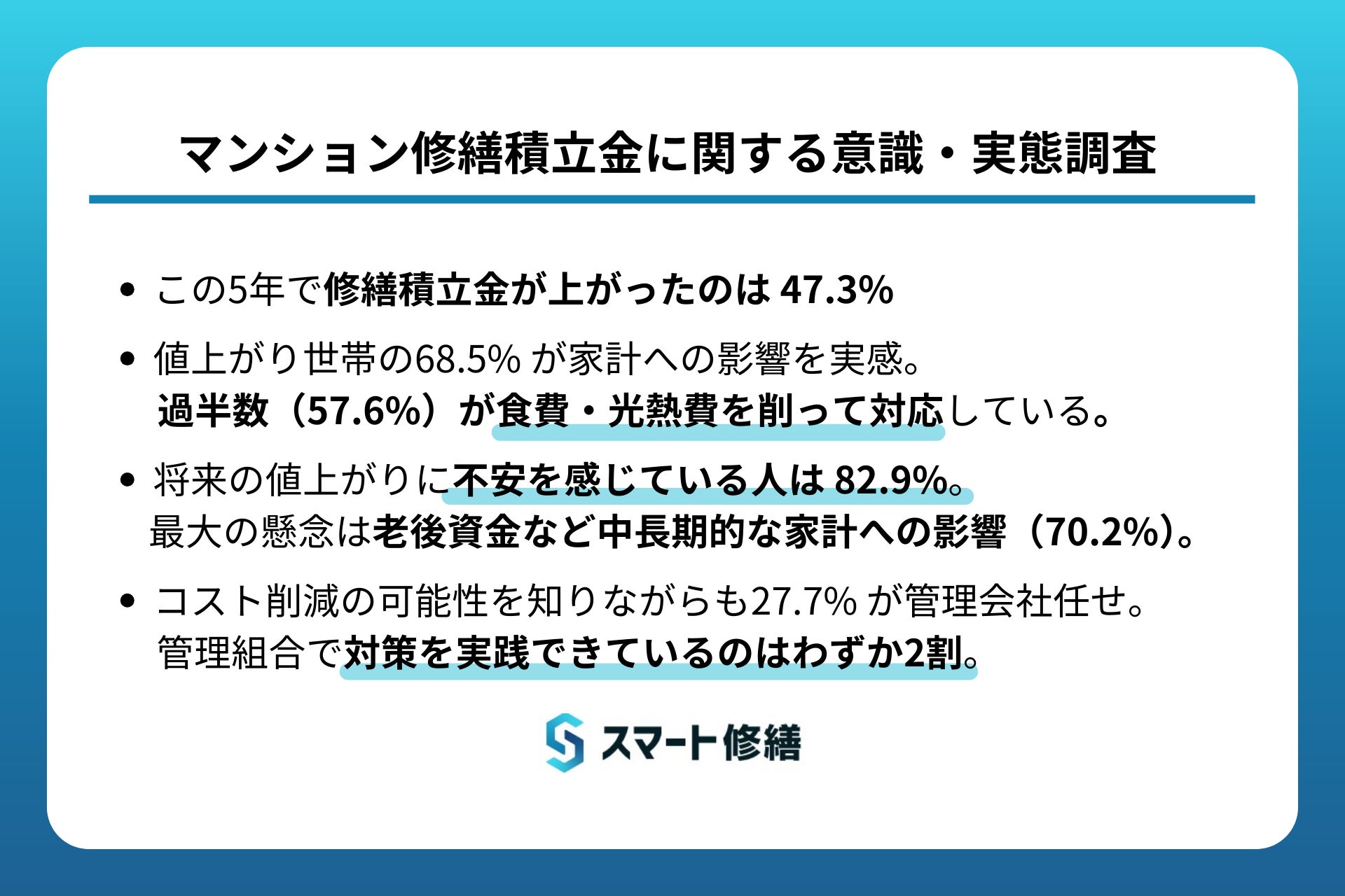 こうした背景を受け、株式会社スマート修繕は「修繕費の実態と対策を正しく知ること」が重要と考え、マンション区分所有者を対象とした本調査を実施しました。値上げの実態から家計への影響、将来不安の内訳、そして対策の現状まで、幅広い角度から所有者の本音を明らかにすることを目的としています。