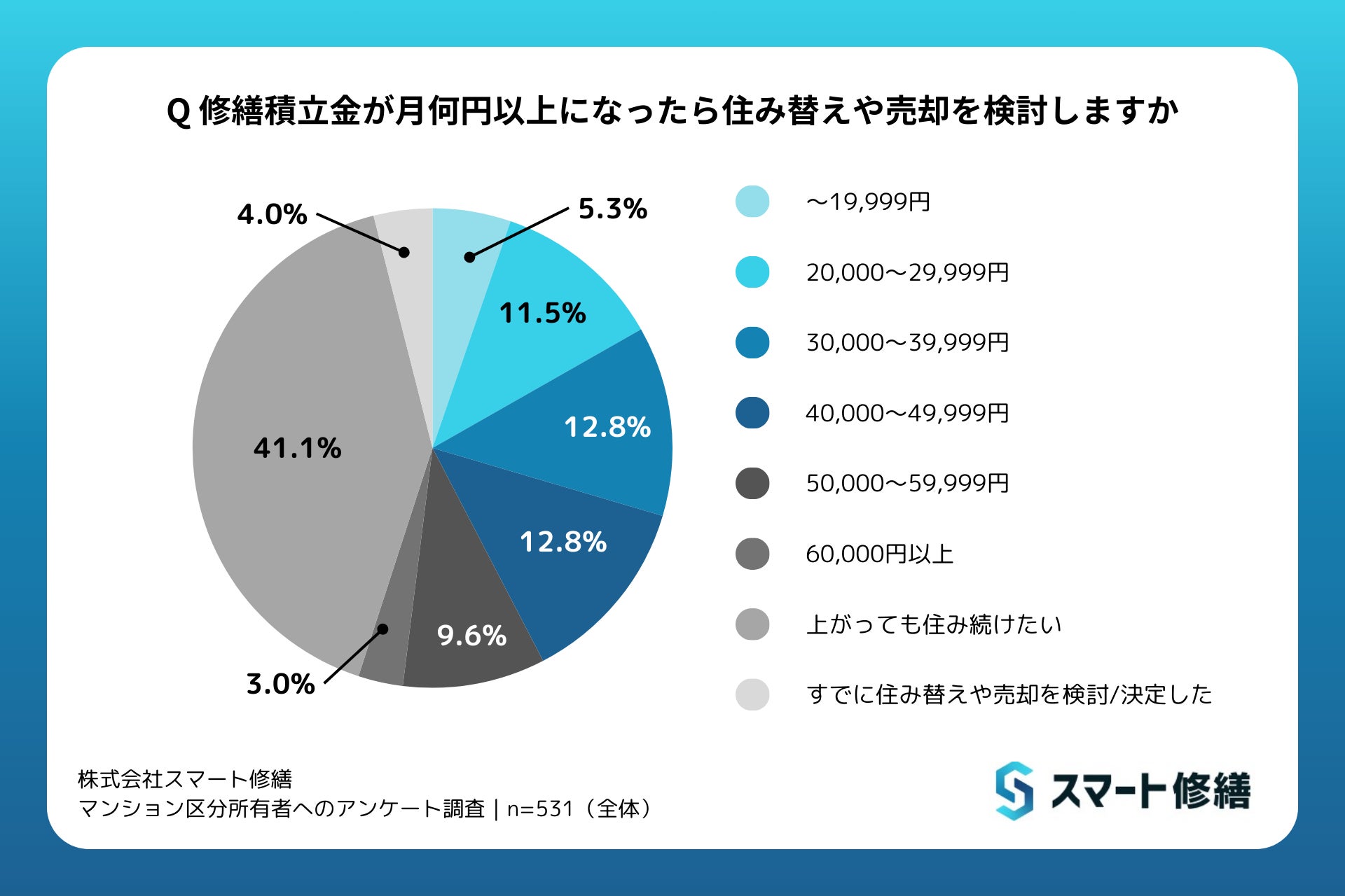 現在の積立額を「高い」と感じる層は51.6%と過半数。「月額いくらになったら売却・住み替えを検討するか」という問いに対し、約3割の層は月額2万円〜5万円のラインを検討の閾値として挙げています。一方で、41.1%は「上がっても今のマンションに住み続けたい」と回答しており、膨らむコスト負担への懸念と、住まいに対する愛着・定住意向の間で揺れ動く住民のジレンマが浮き彫りとなりました。
