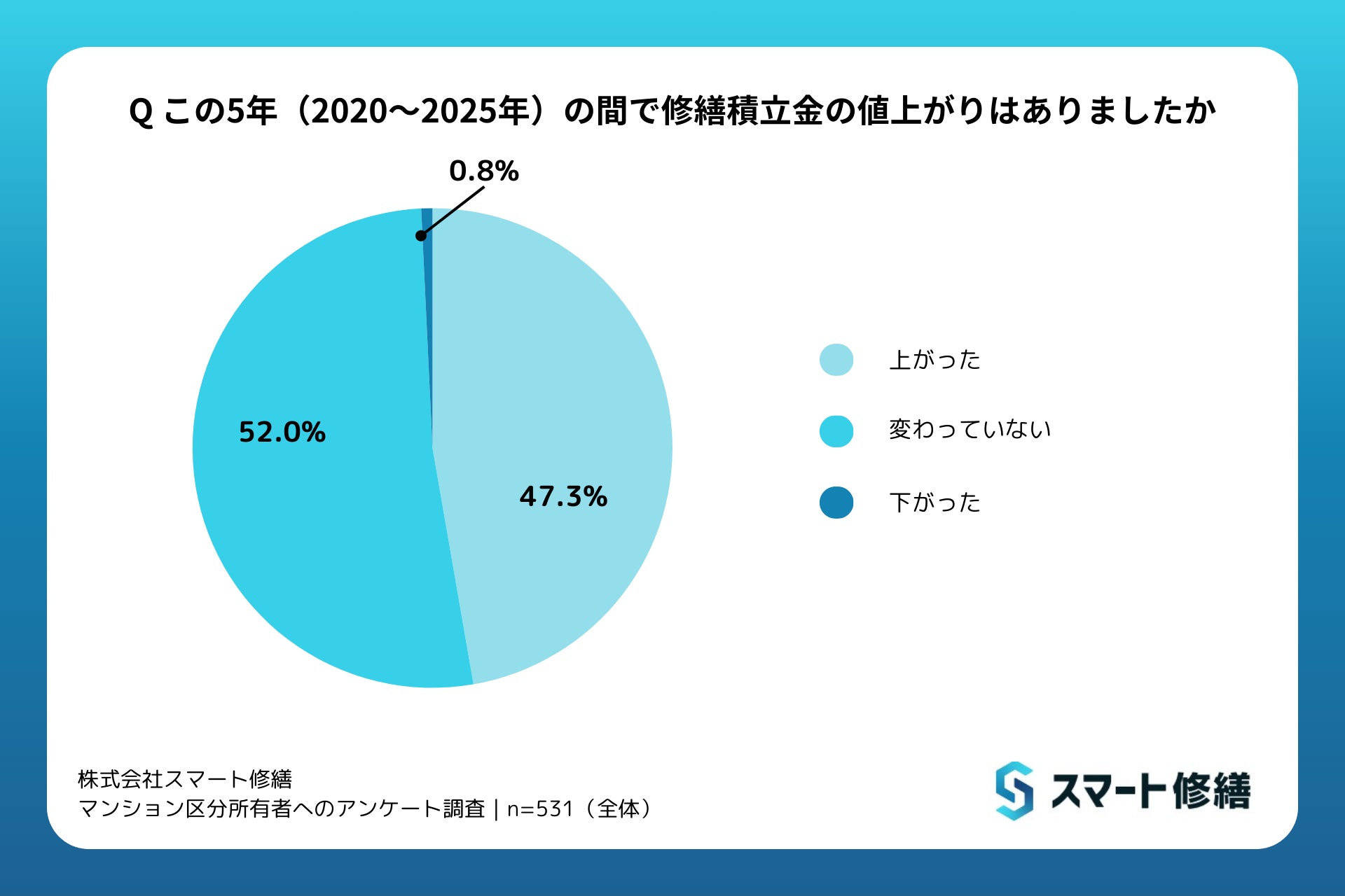直近5年間で修繕積立金が「上がった」と回答した世帯は47.3%、約半数にのぼりました。