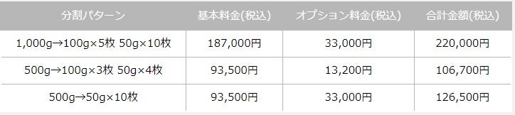 インゴット分割料金は基本料金187円(1gあたり)とオプション料金3,300円(50g 1枚あたり)の合計金額となります。