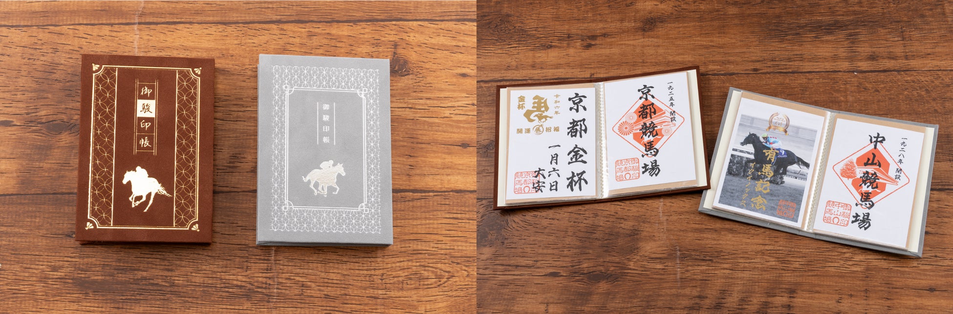 「御駿印帳」は、レースの勝敗だけではない新しい競馬の楽しみ方を提案するために企画・開発した帳面です。「御駿印」をコレクションするためのポケット収納タイプで、KG判サイズまでの写真や勝馬投票券など、レースに関連する思い出の品を御駿印と一緒に収納できます。表紙は鹿毛(かげ)・芦(あし)毛(げ)をイメージし、レースを軽快に駆ける競走馬の印影をデザインしています。