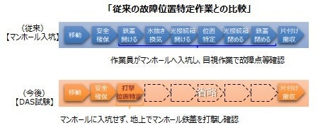 東日本電信電話株式会社(本社:東京新宿区)は、NTTアクセスサービスシステム研究所と連携し、光センシング技術「DAS」※1を用いた通信設備保守を世界で初めて実用化しました※2。 2022年5月23日より東京エリアから順次運用を開始し、全国へ展開します。DASは、光ファイバ心線の超微振動を検知できる技術です。本技術を通信設備保守業務に活用することで、マンホールへ入坑することなく故障位置が特定できるようになるため、業務の効率化が実現できます。本効率化を通して、移動等に伴うエネルギー消費削減も見込めることから、SDGsの達成にも貢献します。NTTグループが目指すIOWN時代においては本運用 を通じ得られたノウハウを生かし、日本中に敷設されている光ファイバケーブルネットワークをセンサとして活用した環境モニタリングを実現することで、多様な産業分野への環境情報の活用と様々な地域社会の課題解決に貢献することを目指します。※1 Distributed Acoustic Sensor:分布音波センシング装置※2 当社調べ