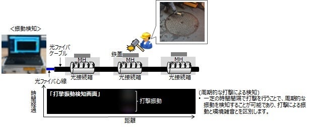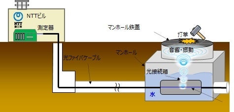 これまでは故障が発生した場合、測定点から故障点までの光ファイバケーブル長に基づいて故障点を探索していましたが、測定点からマンホール等までの正確な位置把握が困難であるため、複数のマンホールに入坑して確認する作業が発生し、手間がかかっていました。本技術を用いることにより、現地でマンホールに入坑する前に鉄蓋をゴムハンマー等で打撃することによって、測定点から打撃したマンホールまでの距離を正確に測定できるため、複数のマンホールへ入坑することなく故障点の設備位置の特定が可能となり、作業の効率化が実現できます。