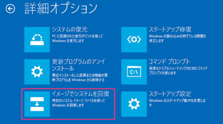 Windowsのシステムイメージからシステムを回復することで黒い画面にカーソルだけ表示される状態が改善されないか確認します。