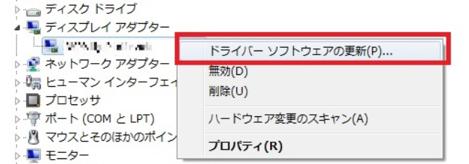 Step3:グラフィックドライバを右クリックして「ドライバー ソフトウェアの更新」を押します。