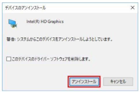 Step6:「アンインストール」をクリックしてドライバのアンインストール後、システムを再起動してからローカルフォルダに保存したドライバーファイルを使って再インストールを進めます。
