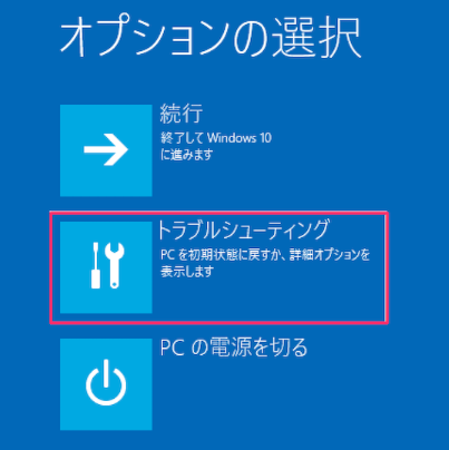 Step1:パソコンの強制終了と起動を繰り返して自動修復を表示後、「詳細オプション」>「トラブルシューティング」とクリックします。