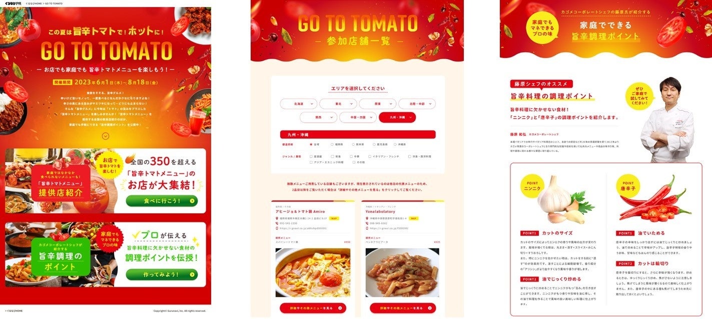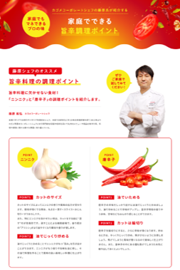 特設サイトでは、全国の「旨辛トマト」メニュー・ドリンクを提供する約350店の飲食店が検索できるほか、自宅でも「旨辛トマト」を楽しんでいただけるよう、プロによる旨辛料理の調理ポイントやおすすめ商品・レシピなどもご紹介します。また、フェア期間中カゴメ公式SNSアカウントなどで、情報発信をしてまいります。