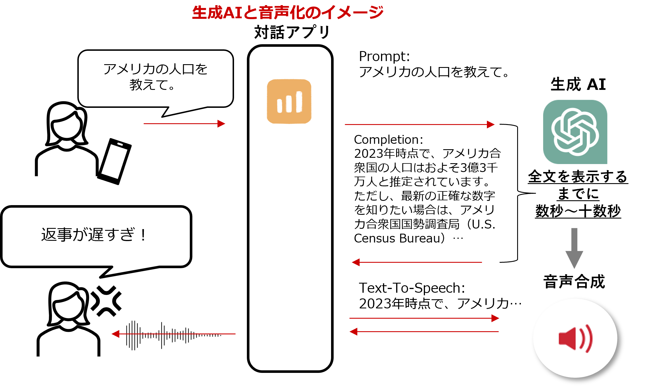 本機能は、生成AIとの音声コミュニケーションをストレスなく、自然に行うためのものです。 ChatGPTをはじめとする生成AIによって、テキストベースではさまざまな場面での対話がスマート化され ました。しかし、そのやりとりを音声で行おうとすると、現状ではヒト側の待ち時間が数秒~長い時には数十秒必要になります。