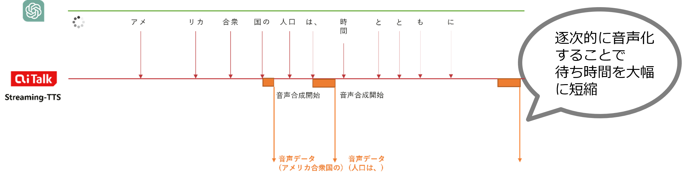 この入力ストリーミング型のAPIによって、全ての文章生成が終わる前から音声合成側でもリアルタイムに解析を行い、入力の途中でも並行して音声を生成します。これにより、生成AIを使った音声対話において生成される文字数がどれだけ長くとも高速に発話応答が可能になりました。