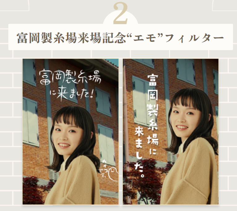 "エモい"写真が撮影できるフィルターです。富岡製糸場に来ました!という文字と一緒にレトロでおしゃれな写真を撮影することができます。