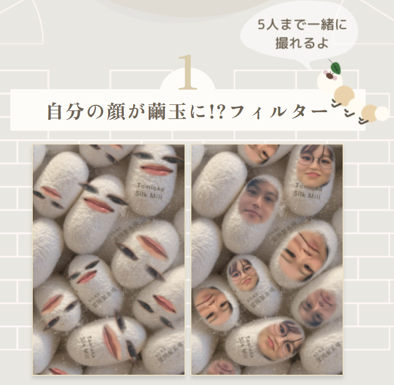 自分の顔が大量の繭玉になるおもしろフィルターです。