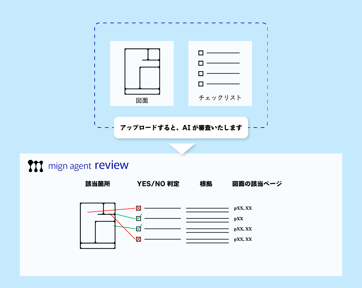 現在、建築業界は、建築物の⾼機能化・複雑化に伴う図⾯枚数の増⼤と、法規制や検証項⽬の細分化という課題に直⾯しています。特に建築確認においては年々複雑化する法規制により必要とされる書類や図⾯の数が増⼤し、不整合につながり、審査の⼿戻りや遅延を引き起こし、確認検査員のみならず、申請者にも極めて⾼い負荷となってきていました。グローバルで培った圧倒的な検査実績を持つビューローベリタスジャパンと、最先端の⽣成AI技術を有するmignが協業し、この課題の解決に取り組んでおります。AIによる⾼度な図書・図⾯解析技術と、⻑年蓄積されたプロフェッショナルの確認検査ノウハウを統合させることで、建築業界の新たな指針(スタンダード)となるイノベーションを⽬指します。