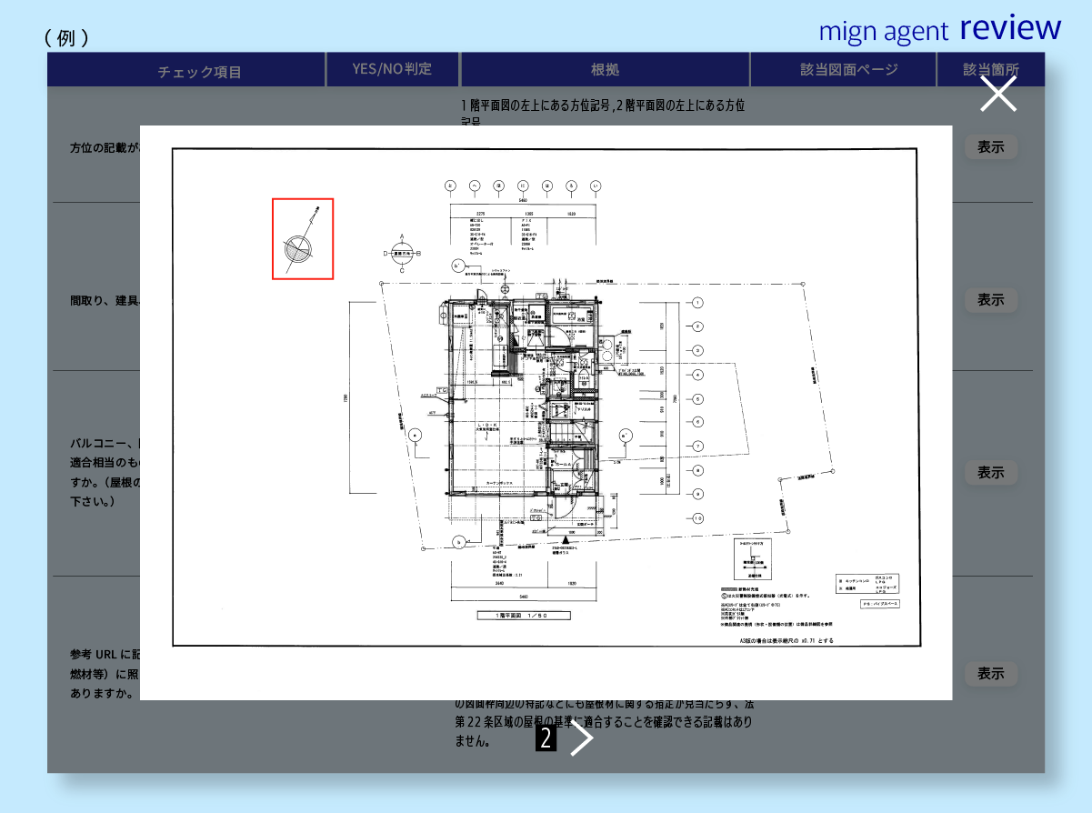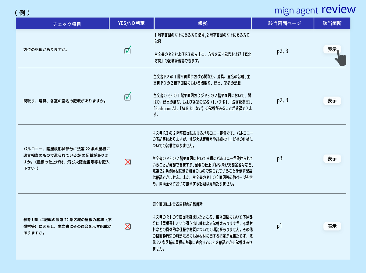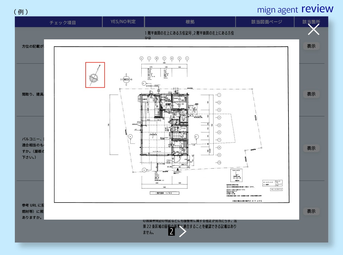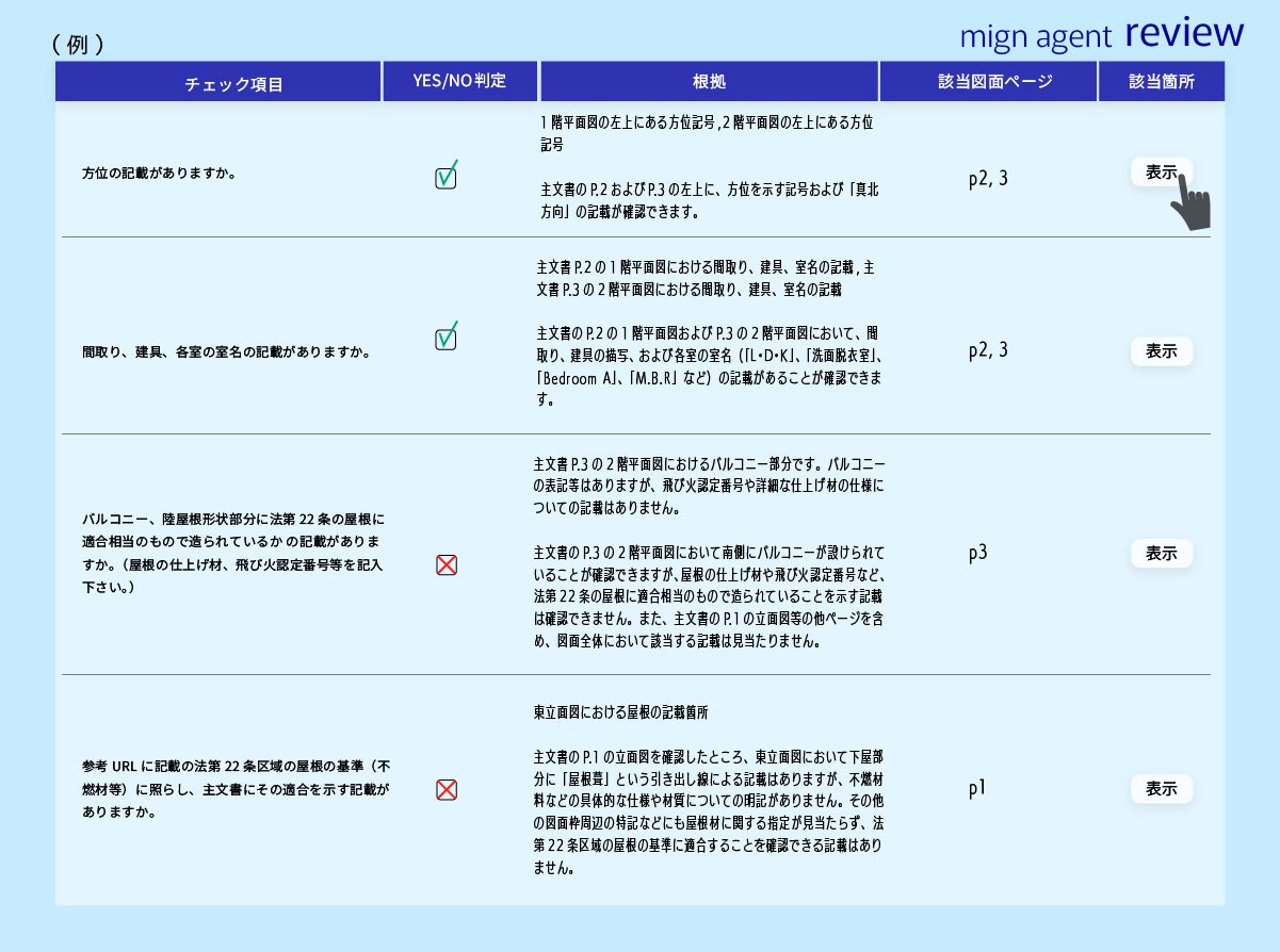 ③審査判断根拠や図⾯内の該当箇所の表⽰も、AIによって出力され、審査のサポートに活⽤します。