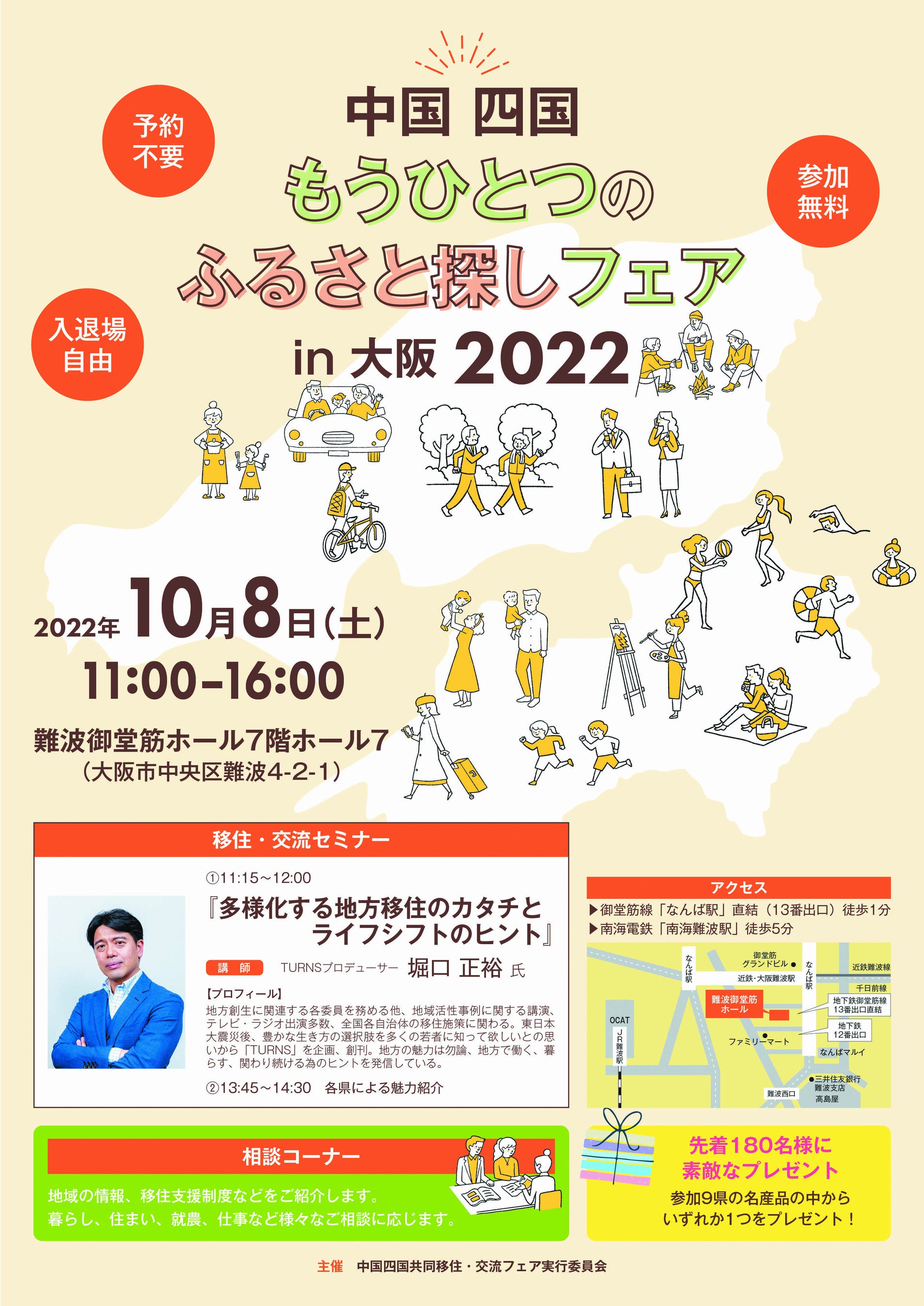 地方への移住を考えている人に、中国四国地方の魅力を知ってもらおうと、中国四国の9県が一体となった合同イベントを大阪市内で開催します。予約不要・参加無料・入退場自由で、お気軽にご参加いただけます。