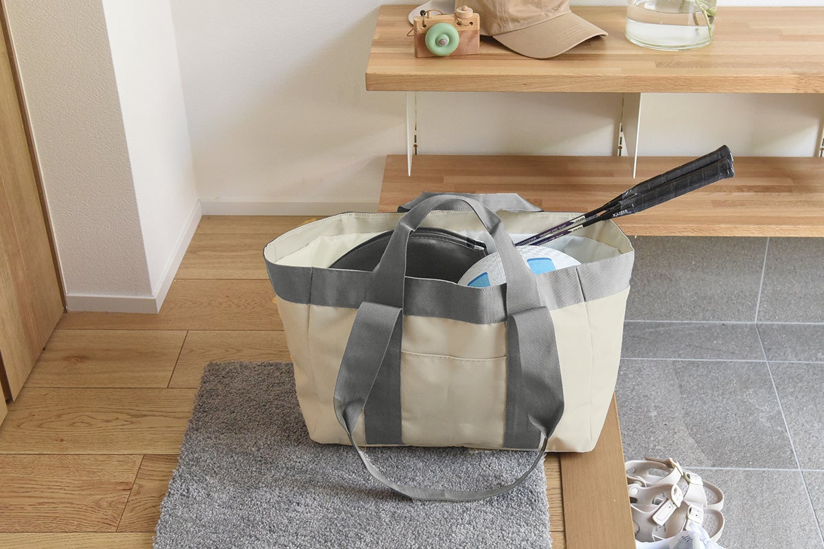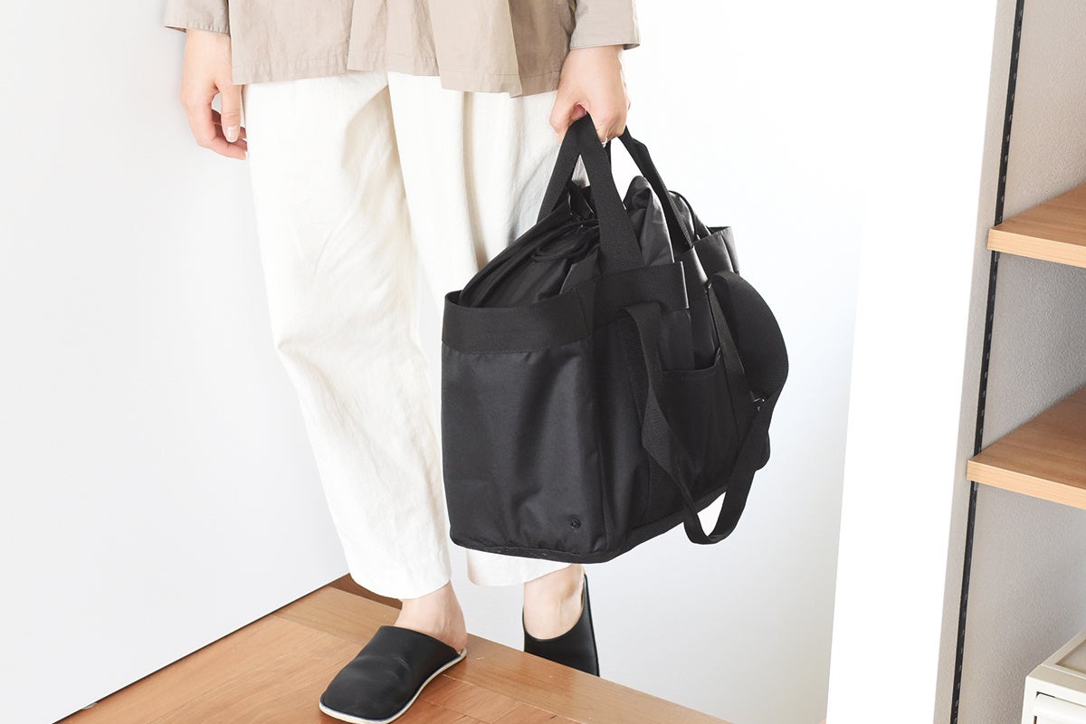 内容量約20L、耐荷重約20kgとたっぷり入るサイズ感で、日常使いからキャンプやピクニックなどのレジャーシーンでも活躍してくれます。口部分は巾着仕様なので、中のものを目隠ししながら、持ち運ぶときの安定感も抜群。