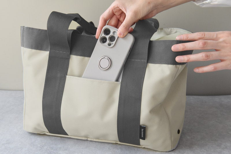 バッグの両サイドに約縦18cm×横13.5cmのポケットをつけているので、スマホや鍵などの一時収納に便利です。