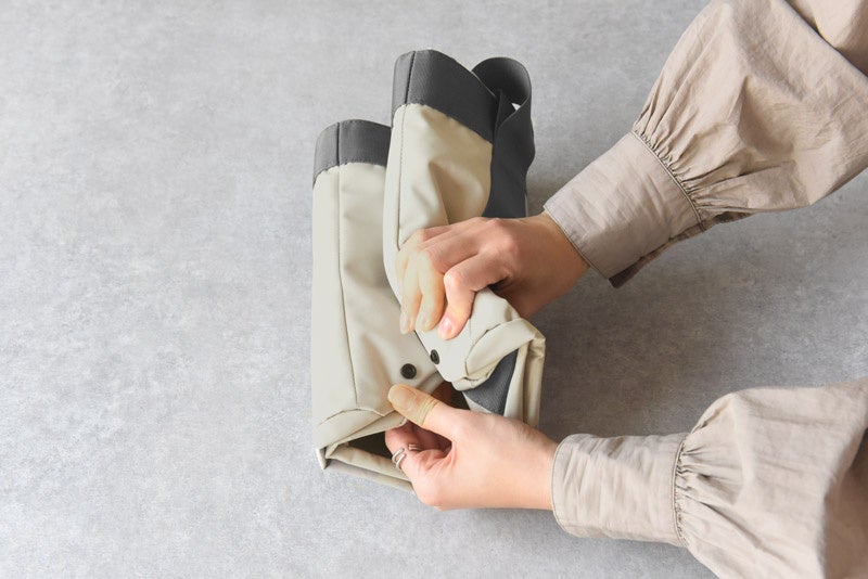 小さくたたんでサイドについているスナップボタンを留めればコンパクトになり、手持ちのバッグに常備しておけば、平日のスーパーでの買い足しも困りません。
