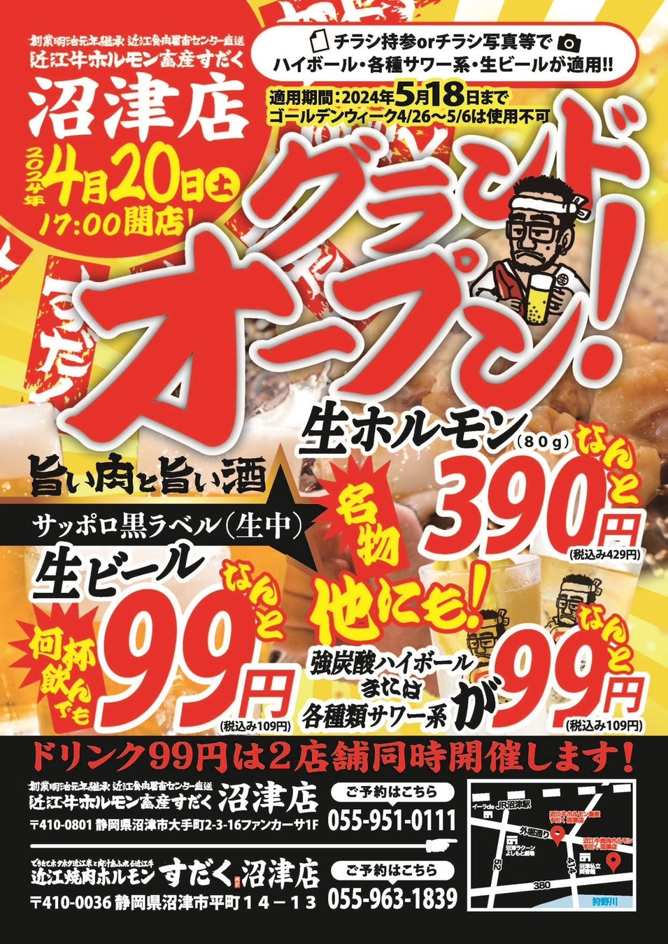 2024年4月20日(土)の近江牛ホルモン畜産すだく沼津店のグランドオープンを記念して、「生ビールと強炭酸ハイボール、各種サワー系がなんと!!!99円!?」キャンペーンを開催いたします。