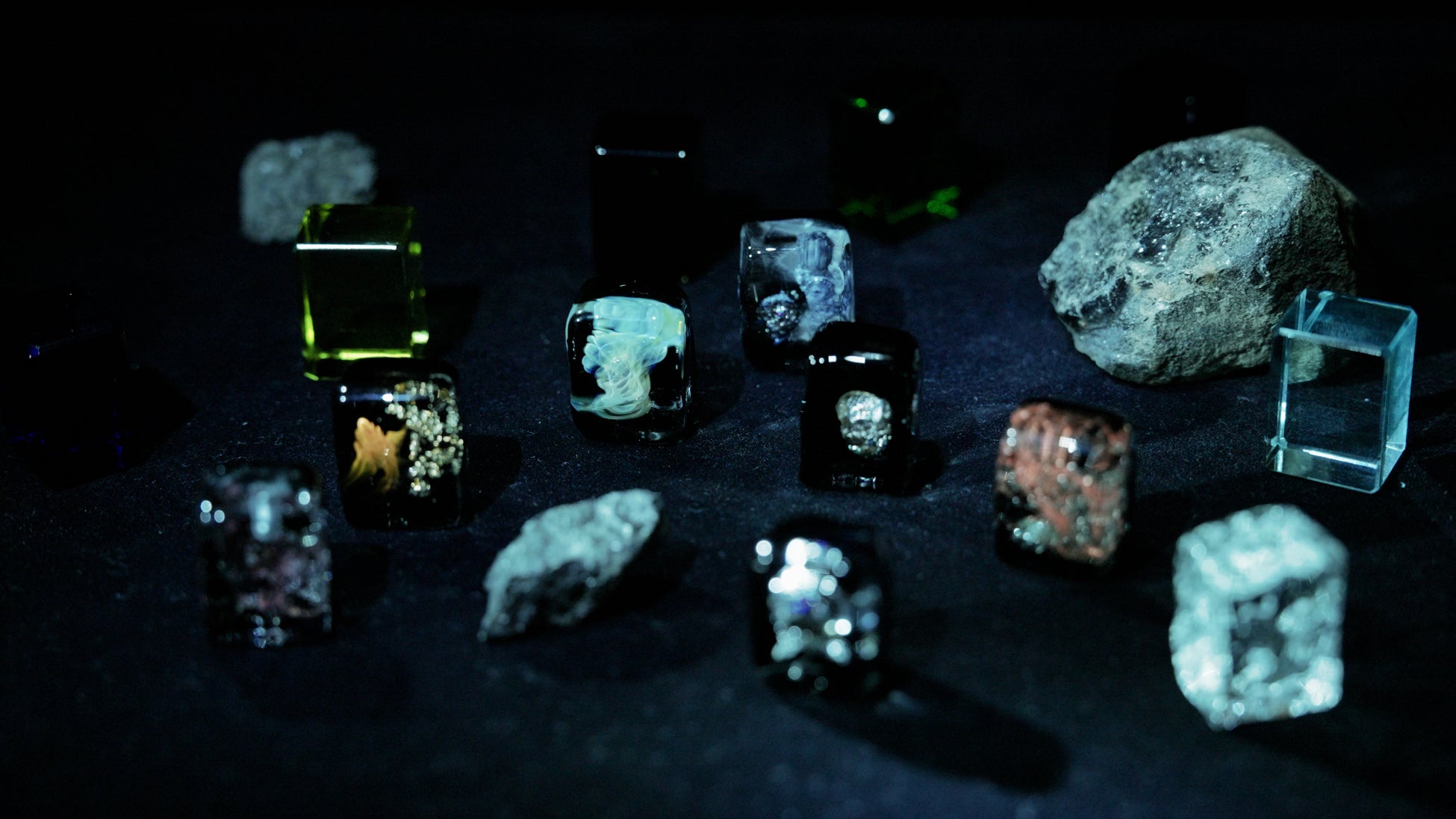 本展示ではガラスの特性を通じて素材の本質を理解していただくとともに、ガラスの中にクルマの素材を閉じ込めることで、素材の多面的な変容を表現します。それにより作品たちを通して、その不思議な情景を「クルマの記憶」として垣間見ることができます。