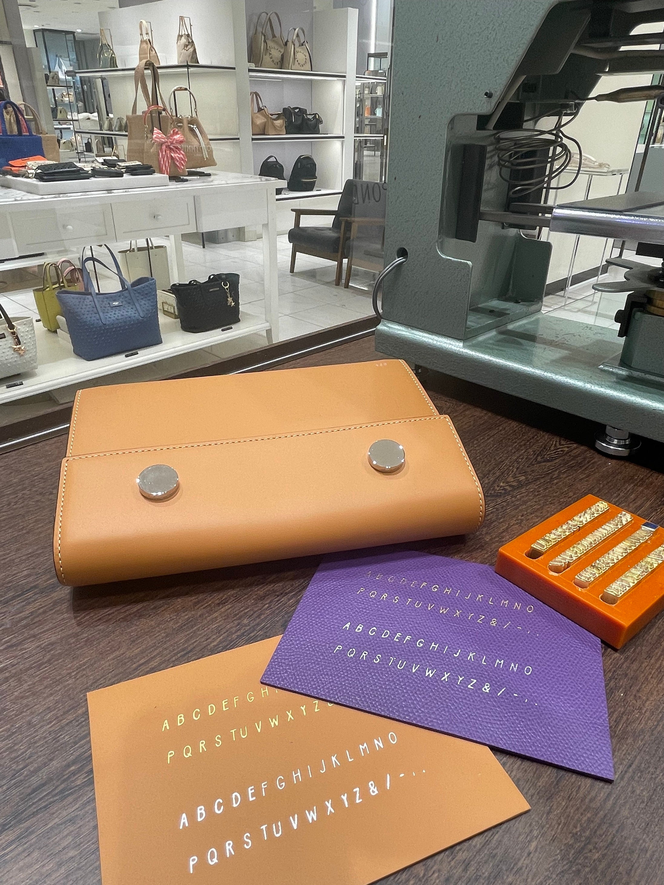 オリジナルフォントでの刻印サービス(無料)(7日で終了)や、バッグと財布をお買いあげの方への布製のオリジナルショッパーでの包装サービスなどもご用意しています。