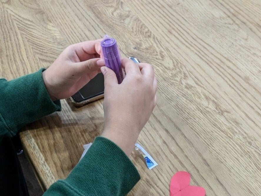 当授業では、実際に子ども達一人ひとりにコンドームを手渡し、正しい装着方法を練習します。