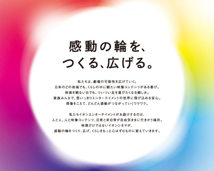 特に劇場ならではの高画質な映像システム、迫力あふれる音響、当社の強みである、全国で同時開催も可能なネットワークの利便性、気軽に来場しやすい立地・アクセスの良さなどを活かし、映画だけでなく、あらゆる エンターテイメントをお客さまに提供。イオンシネマから”感動の輪“を創出し、劇場ならではの体験価値やコンテンツの提供を一層強化してまいります。