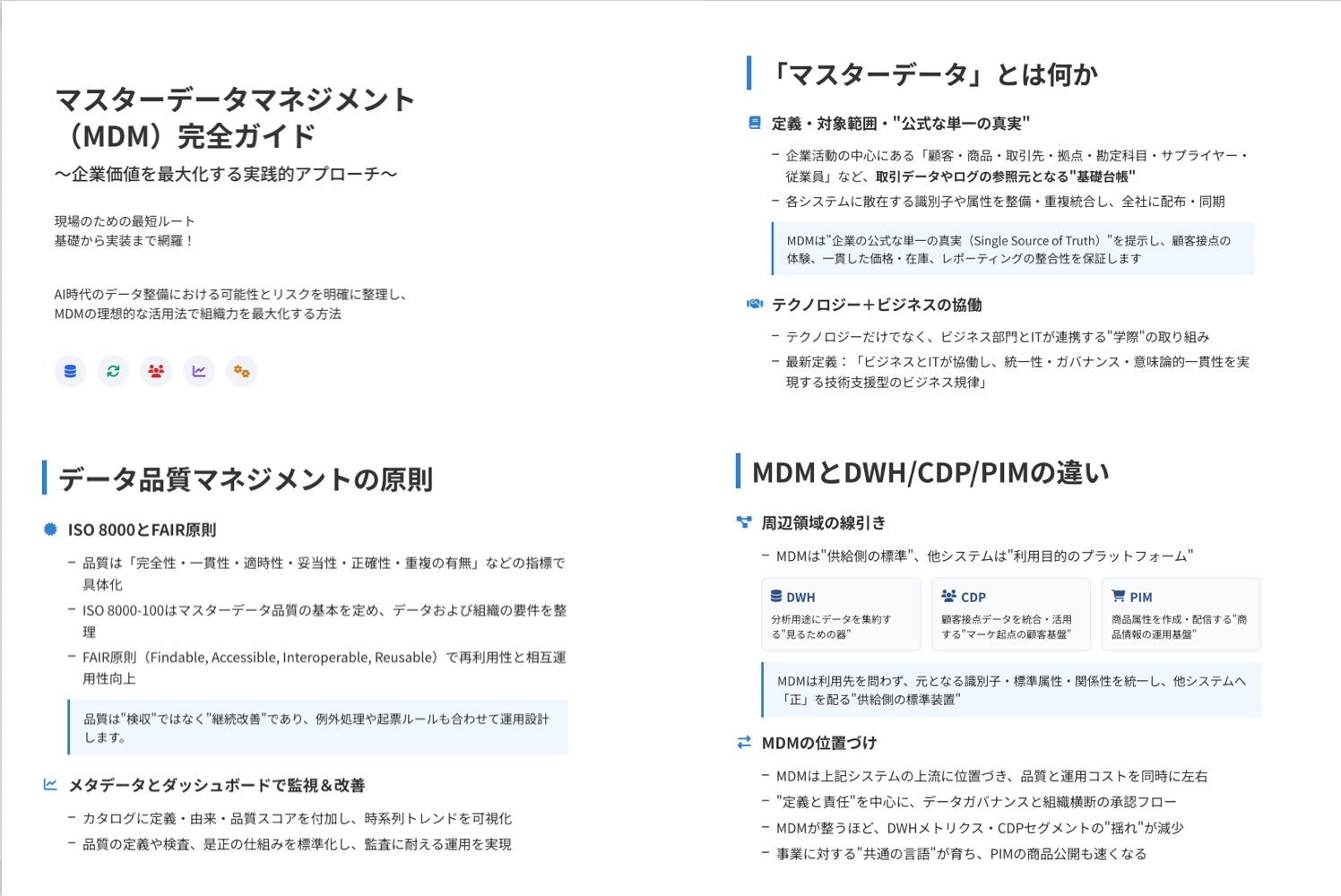 〜最新の実践とリサーチを踏まえて、MDMの基礎からガバナンス、技術選定、KPI設計、実装ロードマップまでを俯瞰し、明日から使える具体策に落とし込み〜