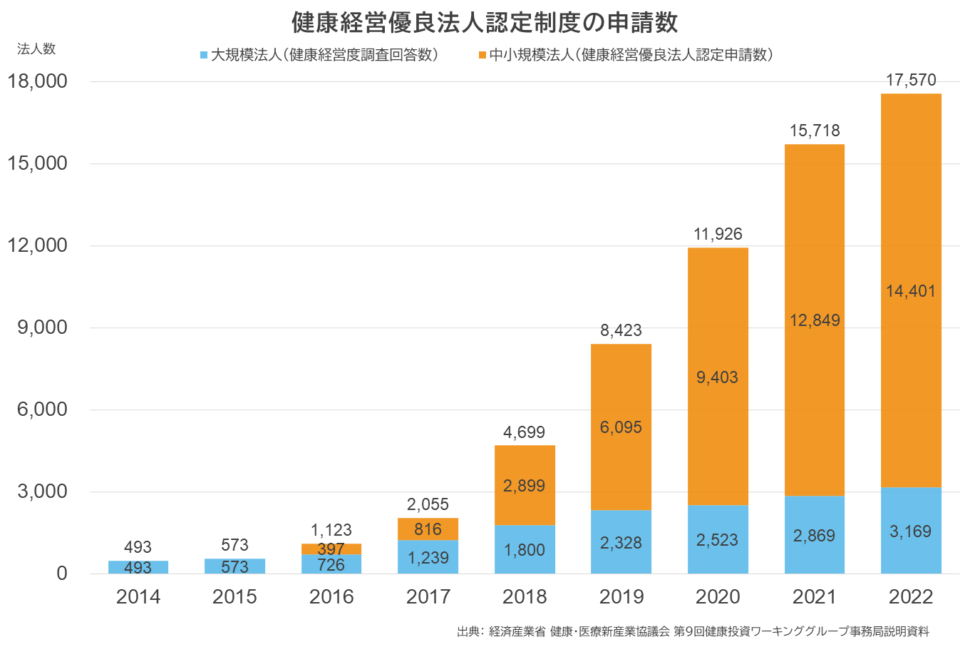 経済産業省の認定制度である「健康経営優良法人」の認定状況によると、2022年度に申請した法人約17,000社のうち、14,000社以上が中小規模法人でした。企業が従業員の健康保持・増進に取り組むことによって従業員の生産性が高まり、業績の向上や企業価値の向上に繋がります。また、人材の定着や採用面にも良い影響を与えることから、大企業だけではなく、中堅・中小企業でも従業員の健康管理を経営的な課題と捉え、健康経営に取り組む動きが加速しています。