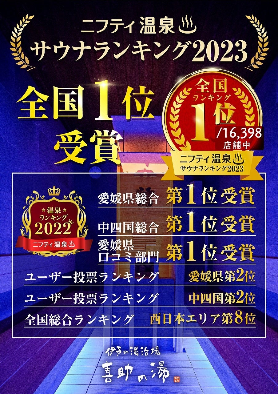 「二フティ温泉 サウナランキング2023」で日本一に輝いた「伊予の湯治場 喜助の湯」は、充実のサウナ施設を備えるほか、魅力的な温泉設備の提供にも力を入れています。YouTubeやInstagramに欠かせない「映え」の要素も満載で、総合的に満足度の高い温泉体験・サウナ体験をご提供します。