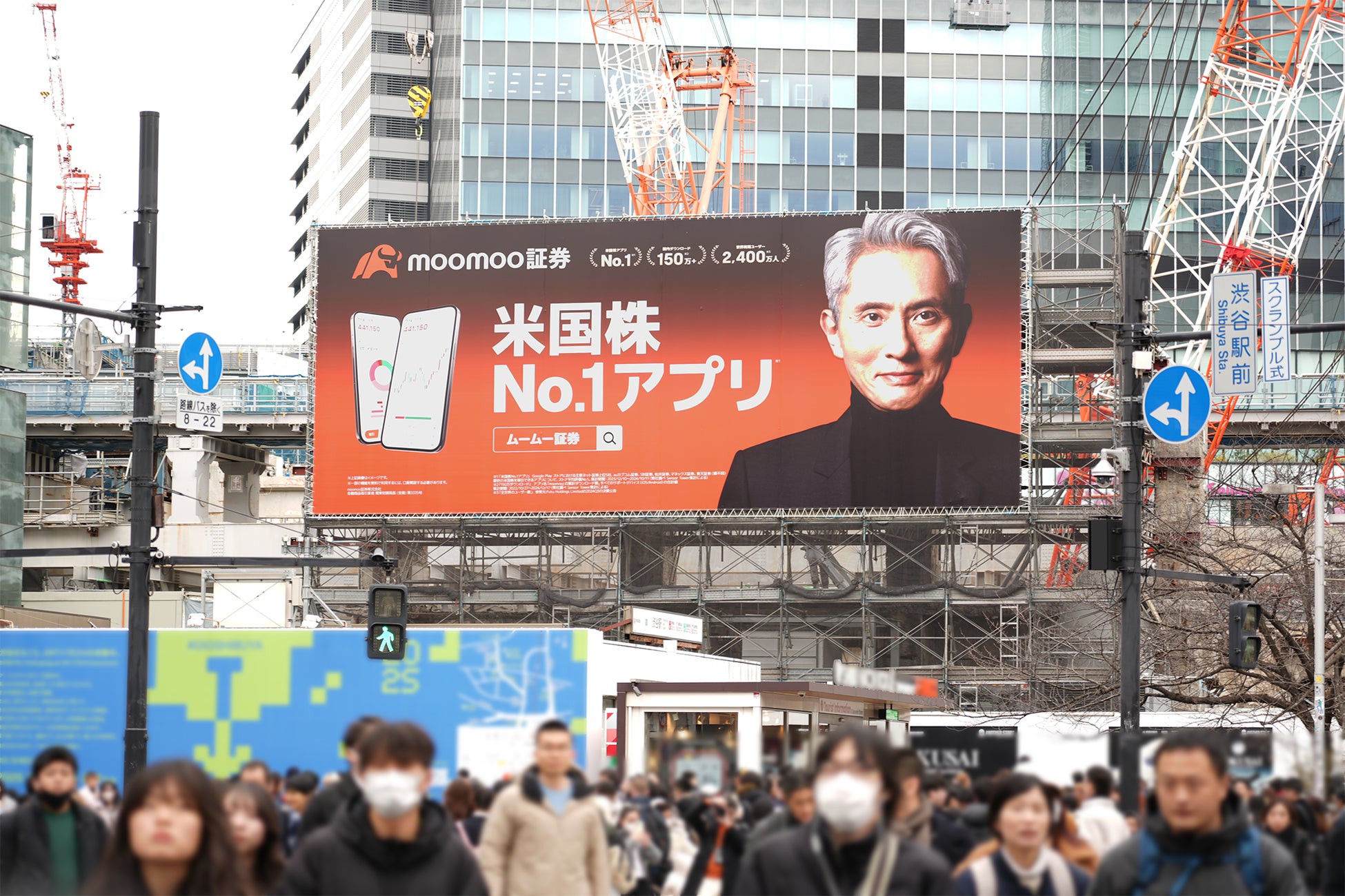 国内では2025年年始から2月14日までの期間中、moomoo証券(本社:東京都渋谷区、代表取締役社長:伊澤フランシスコ)のブランド・アンバサダーである俳優の松重豊さんがmoomooのブランド・カラーのオレンジ色を背景に、千代田区・丸の内ビルディング内の大型ビジョン広告、丸の内地下街や、渋谷区・渋谷駅のハチ公前広場の屋外広告などに登場。大都会の中心で、moomoo証券の強みである「米国株No.1」(※1)をアピールしました。