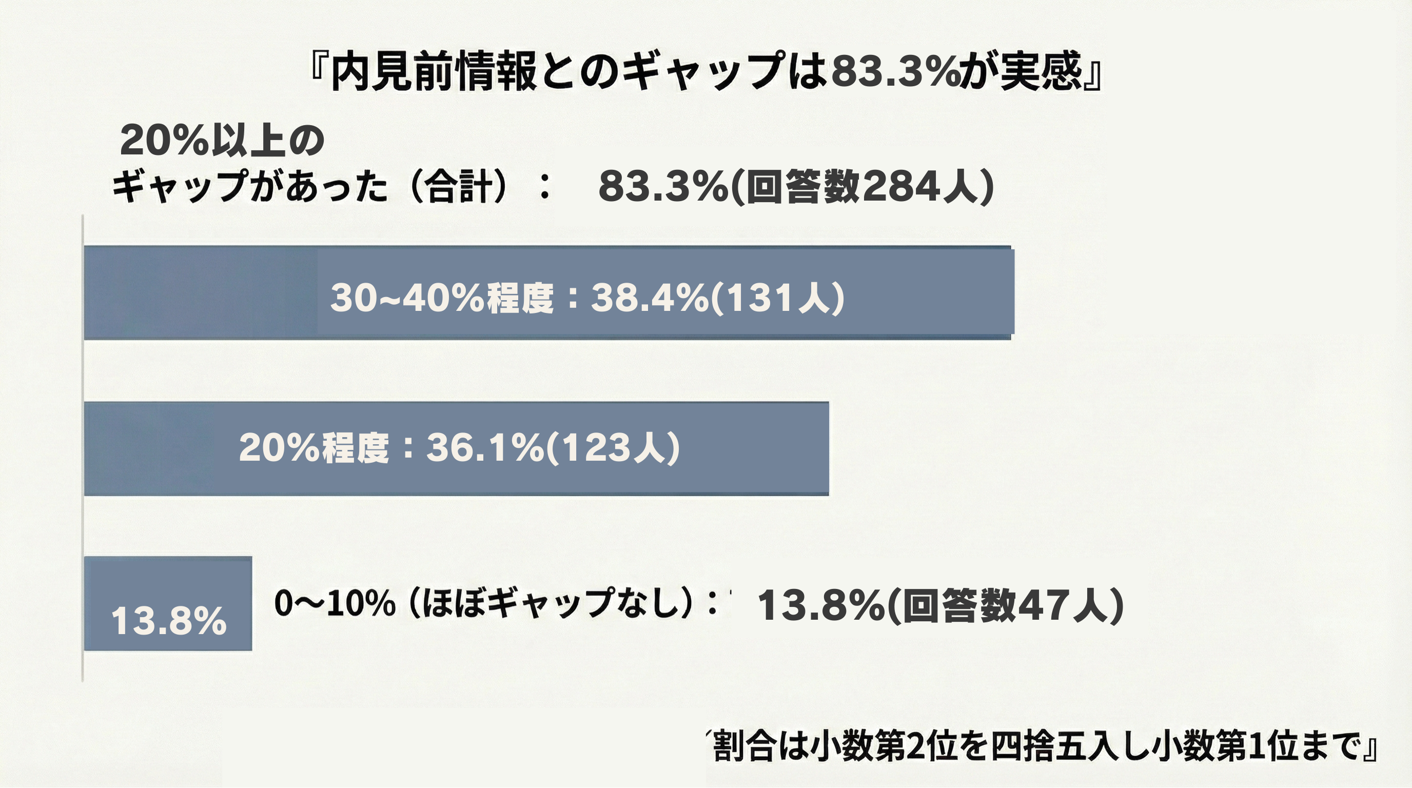 これまでの経験上、内見前の情報(写真・間取り図・説明など)と、実際に内見した印象のギャップについて聞いたところ、ギャップがあったといえる回答(20%以上のギャップ)は83.3%(284人)でした。