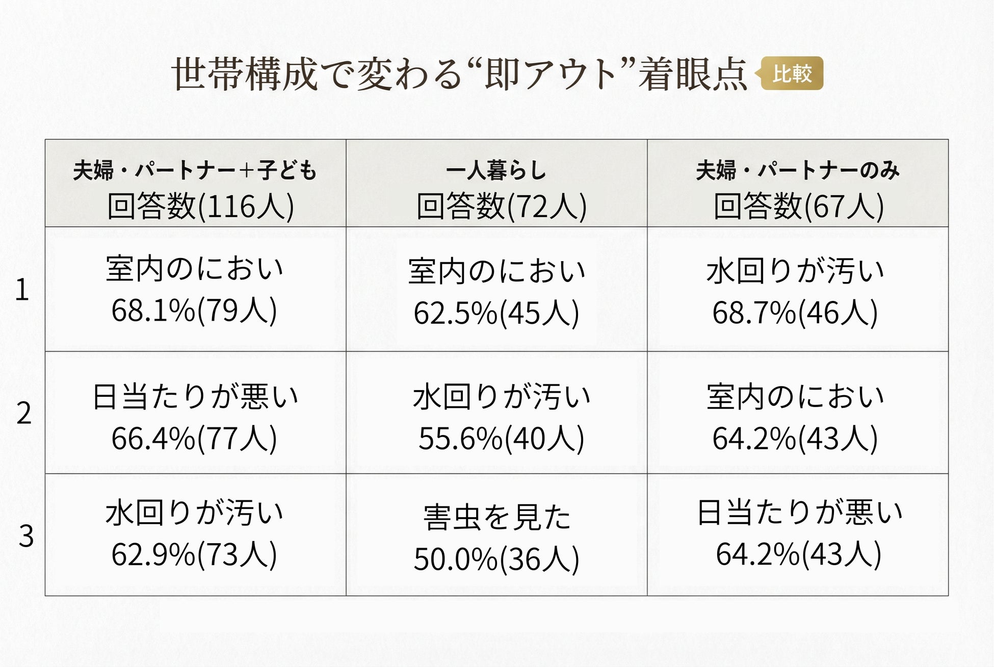 候補外になりやすい条件の上位は、室内のにおい、水回り、日当たりといった、入室直後に体感しやすい要素でした。即アウトの決め手としては視覚や直感・雰囲気が多く、判断は個別条件よりも「その場の空気感」に左右されやすい傾向が見られます。