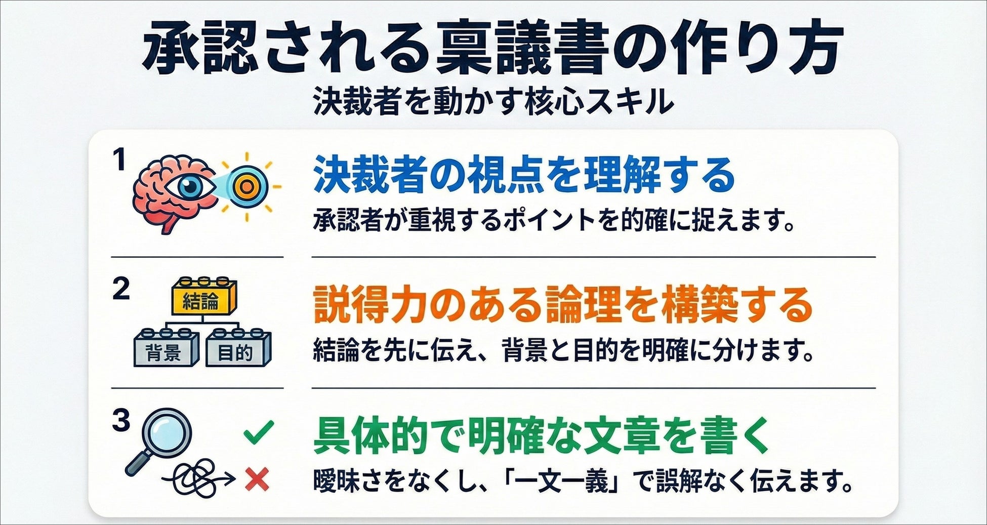 承認者がどこを見ているのか、立場による違いや重視するポイントを把握し、決裁者目線の書き方を身に付けます。