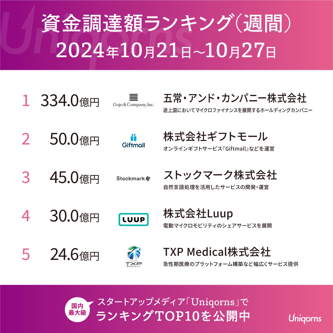 国内最大級のスタートアップメディア「Uniqorns(ユニコーンズ)」が2024年10月21日〜10月27日のスタートアップ資金調達状況をランキング形式で発表