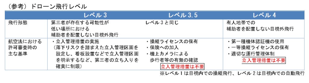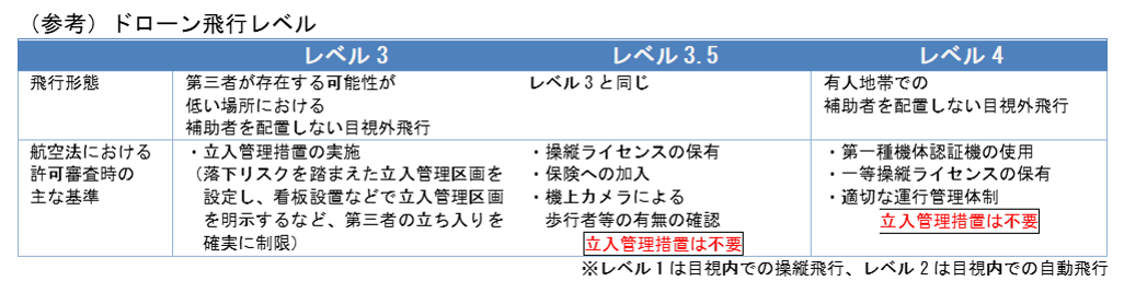 ※レベル3.5飛行…ドローンを目視外飛行させる際に、一定の条件をクリアすることで実施できる、