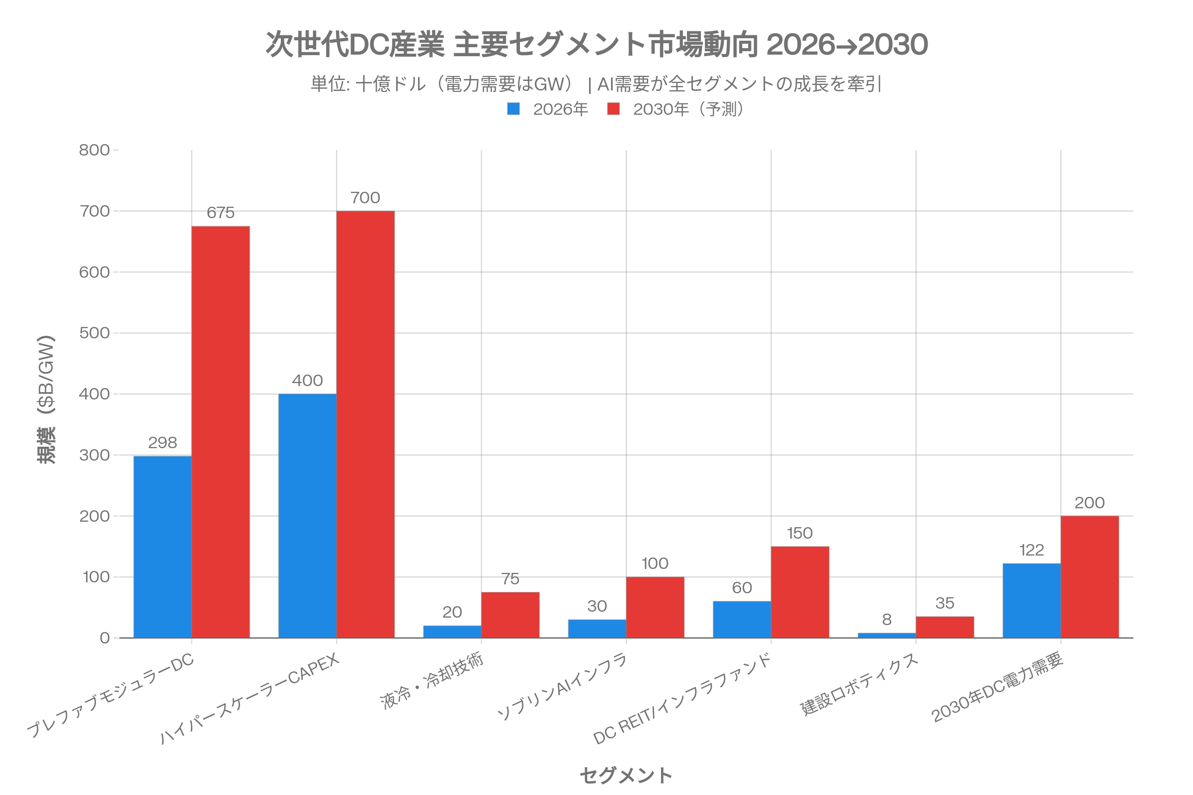 AIファクトリー時代のインフラ供給スピードを規定するプレファブモジュラーDC市場は、2026年の298億ドルから2030年の675億ドルへ急成長する。工期30〜50%短縮と品質向上のメカニズムが、ハイパースケール建設の標準パラダイムとなる。