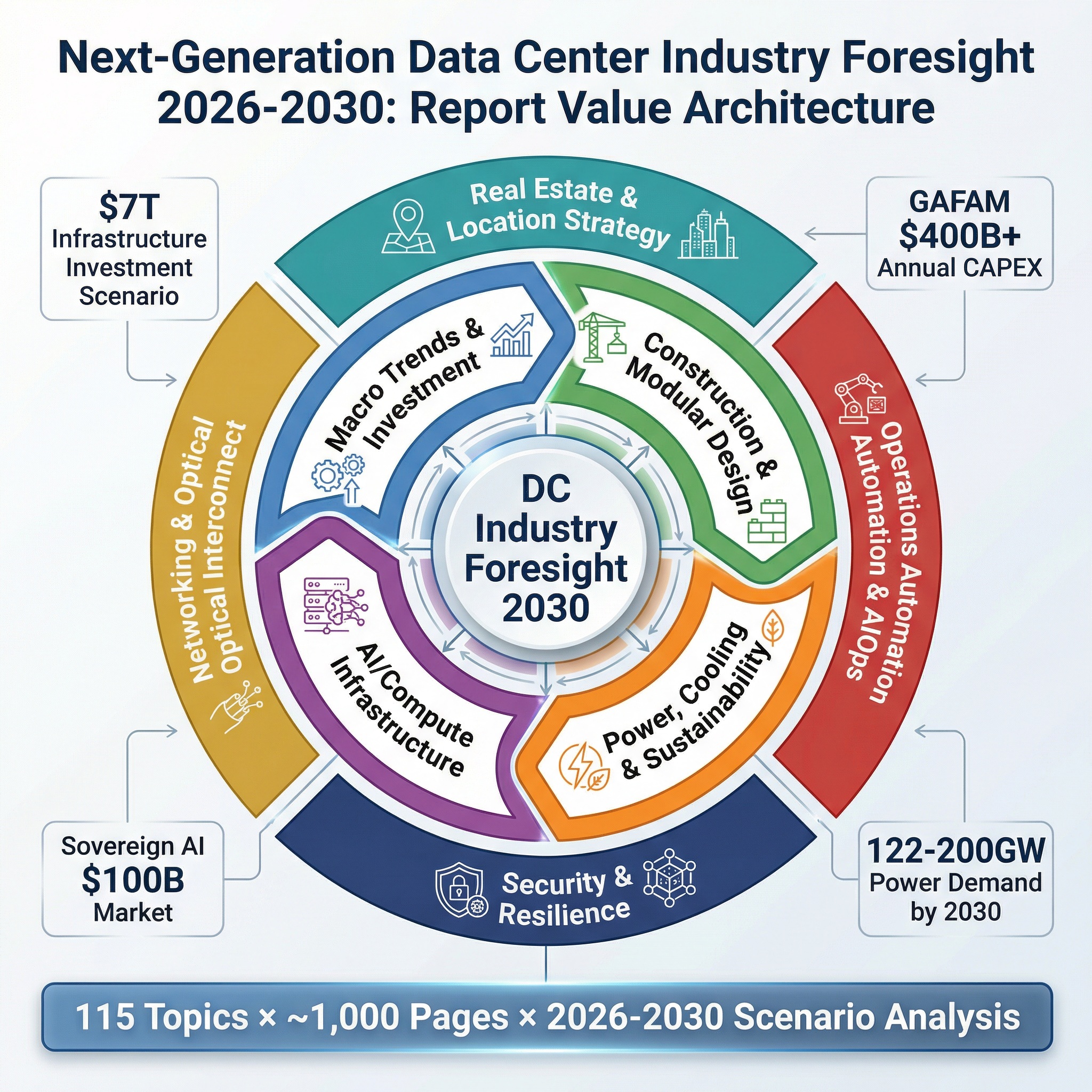 本白書は、2026年から2030年にかけてのデータセンター産業を「マクロ動向・投資」「建設・モジュラー設計」「電力・冷却・サステナビリティ」「AI/コンピュートインフラ」「不動産・立地戦略」「運用自動化・AIOps」「セキュリティ・レジリエンス」「ネットワーク・光伝送」の8領域にわたり体系的に分析した、業界初の統合フォーサイトレポートである。