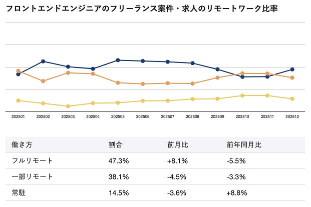2025年12月時点のフロントエンドエンジニア向けフリーランス案件・求人におけるリモートワーク比率は、フルリモートが47.3%、一部リモートが38.1%、常駐が14.5%となっています。フルリモートと一部リモートを合わせると全体の8割以上を占めており、在宅を中心とした働き方が主流といえるでしょう。