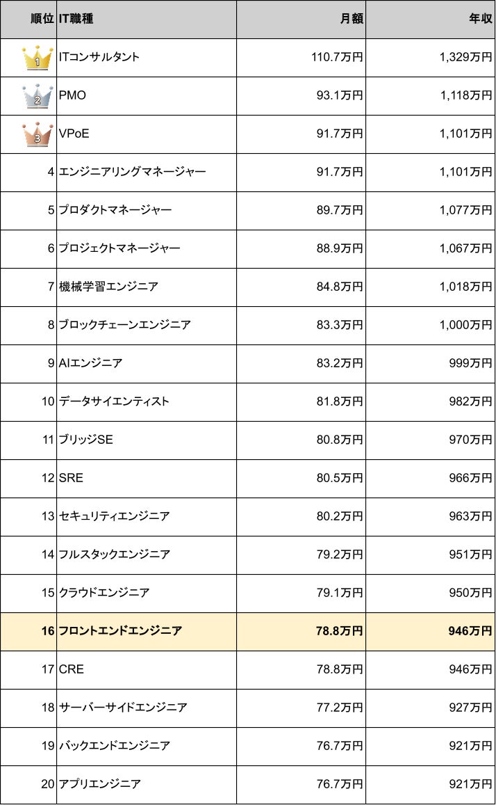 フロントエンドエンジニア案件の平均月額単価は78.8万円、平均年収は946万円で、IT職種別の年収ランキングでは16位に位置しています。