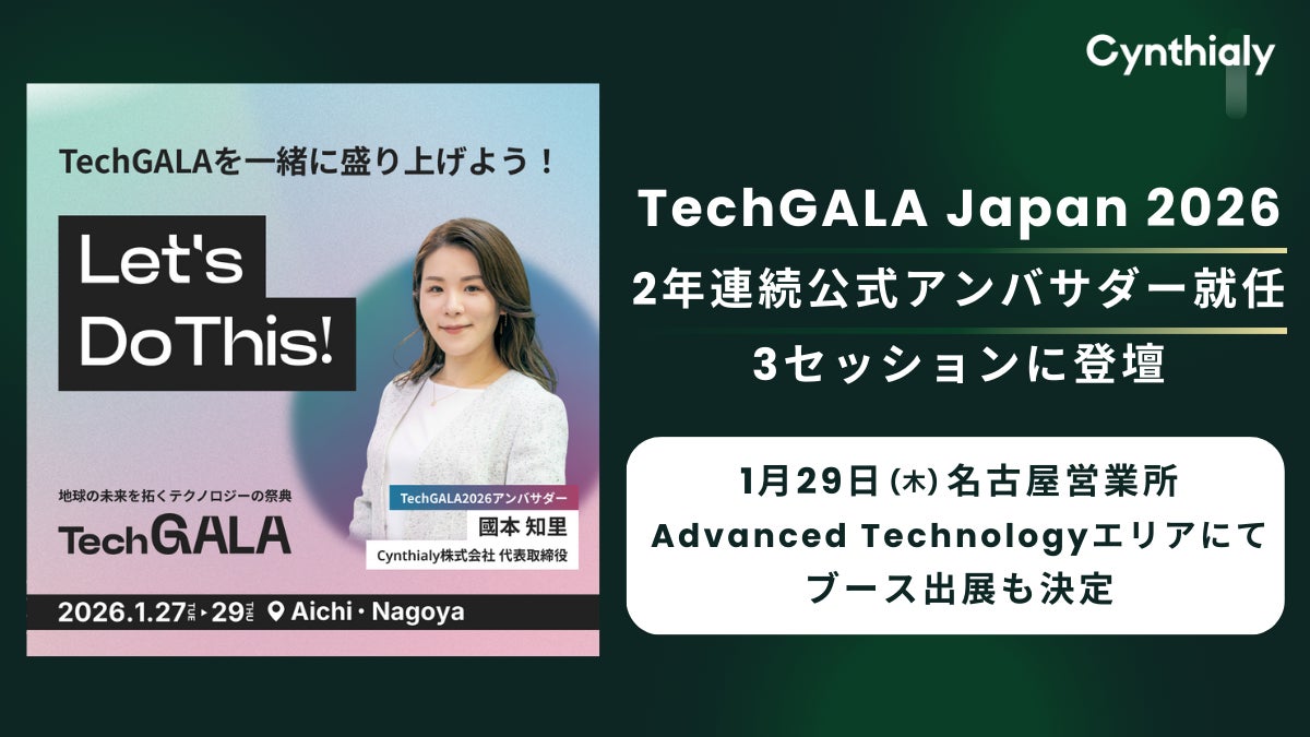 法人向けの生成AI人材育成・導入変革支援を行うCynthialy(シンシアリー)株式会社(本社:東京都渋谷区、代表取締役:國本知里、以下シンシアリー)は、国内外から5,000名以上が集う地球の未来を拓くテクノロジーの祭典「TechGALA Japan 2026」において、代表の國本が2年連続でアンバサダーに就任するとともに、セッションに登壇することをお知らせいたします。また、名古屋営業所としてブース出展も行います。