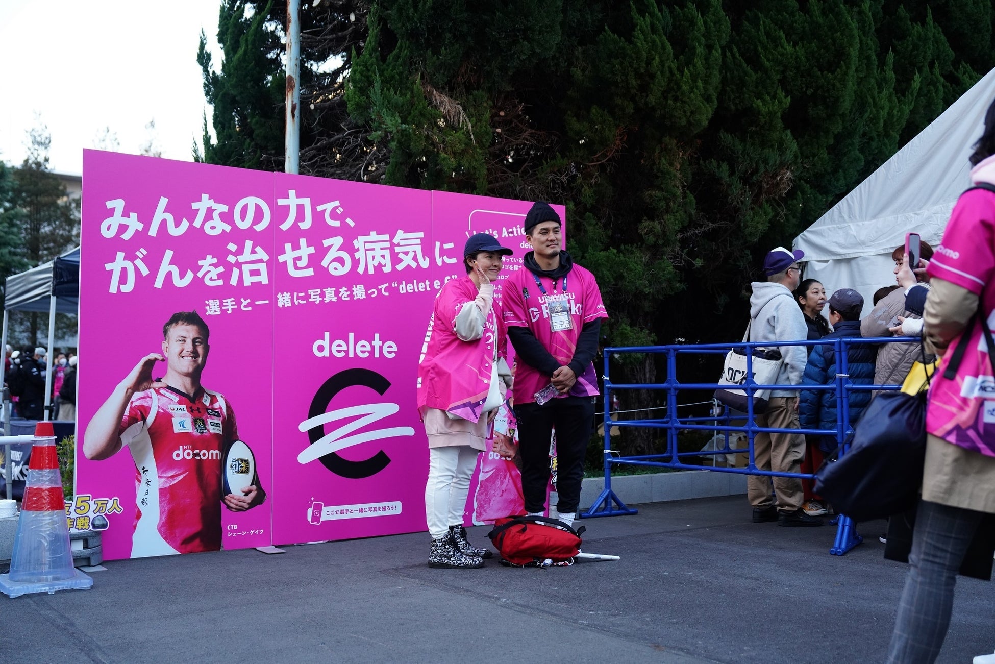 今回のdeleteCマッチは「ONE TEAMの力で、がんを治せる病気にすること」をコンセプトに、ラグビーの力、deleteCのカジュアルソーシャルアクションの力、それらをあつめて、がんを治せる病気にするという未来をみんなで手繰り寄せていこう!と浦安D-Rocksと共に立ち上げた企画です。ご来場いただいた皆様にマゼンタのBBシャツを身に着けていただき、選手もマゼンタのジャージを着て、秩父宮からがん治療研究を進めようとしているすべての人々にたくさんエールを発信できた事を嬉しく思います。開催にあたってご尽力いただいたみなさま、会場にご来場いただいたみなさまに心より感謝申し上げます。ありがとうございました。