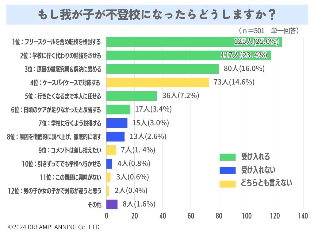 次に、我が子が不登校になった場合どうするか、「受け入れる」「受け入れない」の回答別に聞いたところ以下のような結果になりました。