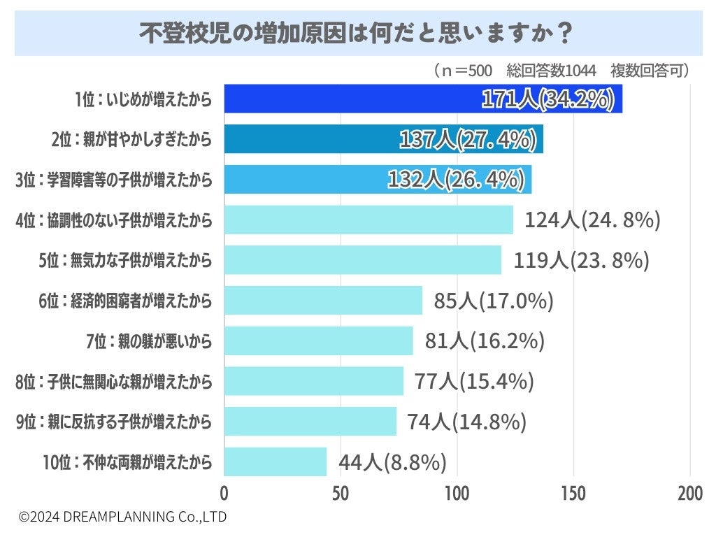 不登校が増えた原因として、いじめが増えたことを挙げる意見が最多でした。