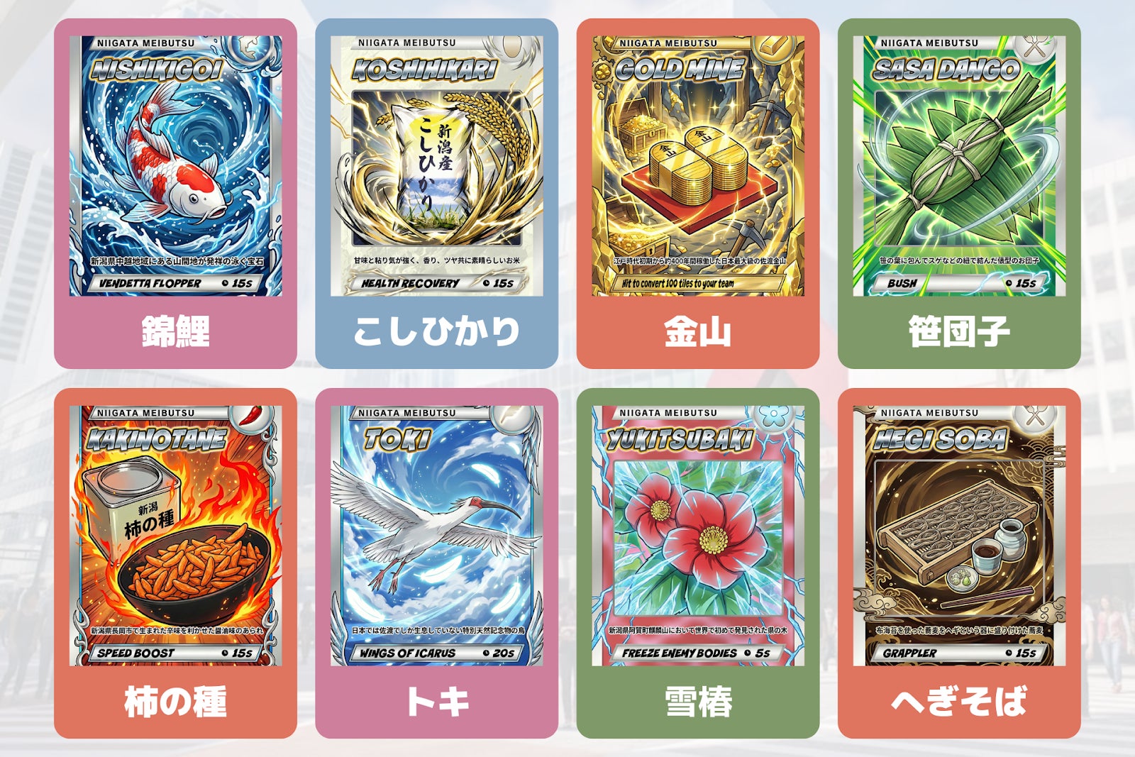 フィールド内に点在する新潟の名産品を取得すると、ゲームを有利に進める様々な特殊効果(バフ)が発動します。地域の食や文化をゲームの戦略要素として取り入れました。