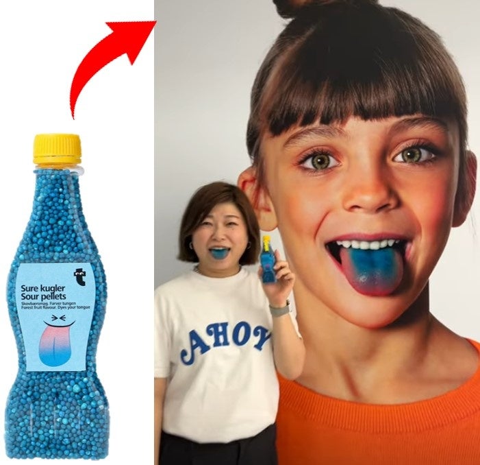 はい、見ての通り、これを食べると、口の中が真っ青に!