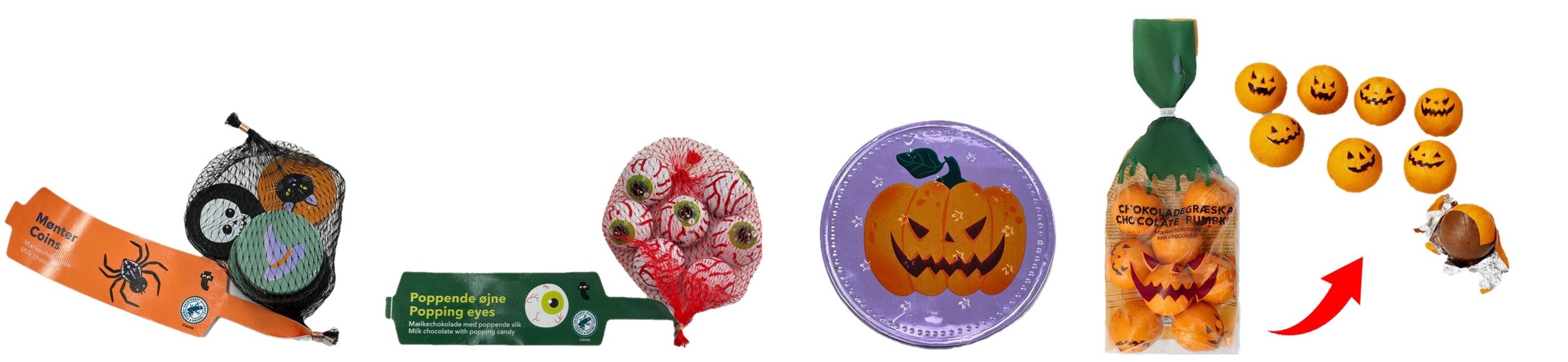 ガイコツ、クロネコ、帽子が描かれたメダル型。ギョロっと目玉にパンプキン!見た目が最高。ばらまきお菓子にぴったりなチョコたち