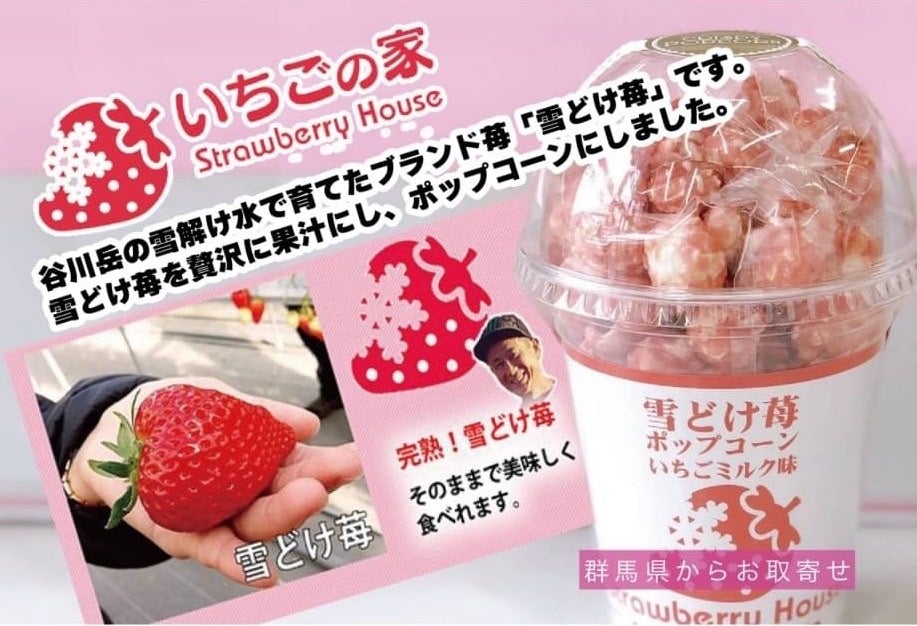 谷川岳の雪どけ水で育てたブランド苺「雪どけ苺」を贅沢につかったポップコーンです。